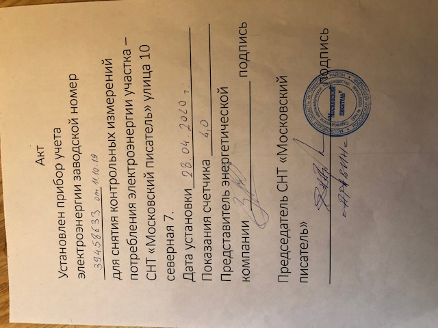 Автор: admin , 30 апреля 2020 Информируем! В связи с недоверием правления СНТ к подаваемой информации по расходу электроэнергии – участок - улица 10 северная 7. Установлен и опломбирован контрольный прибор учета электроэнергии. Составлен соответствующий акт.