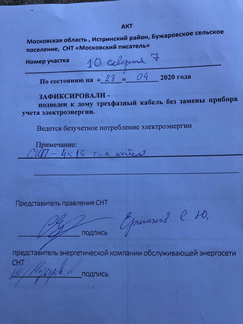 - Зафиксирован факт безучетного потребления электроэнергии у нашего СНТ данного участка 10с7 - К дому подведен трехфазный кабель, без замены однофазного прибор учета электроэнергии ! Акт на фиксирование безучетного потребления электроэнергии в конце текста.