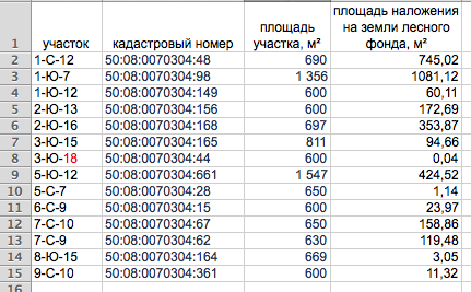 Любопытно, что у участка 1-С-12 площадь наложения с землями лесного фонда больше площади самого участка.