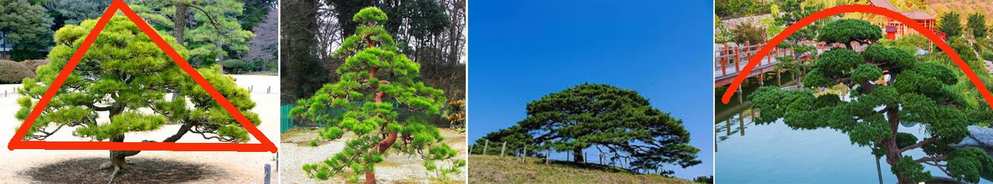 4. ОБРАЗ ГОРЫ. Силуэт у каждого дерева свой. При этом наиболее гармоничной и легкой в уходе будет крона, которую можно вписать в фигуру треугольника. Это образ горы. Она может быть и более пологой, и более крутой. Если гора состоит из нескольких вершин, то на нее можно накинуть общий купол. Те ветки, которые сильно выбиваются из контура горы, чаще всего не нужны. Форма горы достигается, если верхние ветки укорачивать сильнее, чем нижние.
