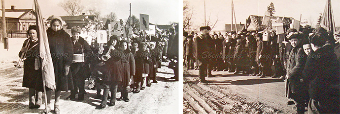 Рис. 3-4. Праздничное шествие в День птиц. Село Саввинская Слобода. 1955 г. https://zvenigorod-gorod.net/den-ptic-v-savvinskoj-slobode/#&gid=1&pid=1.
