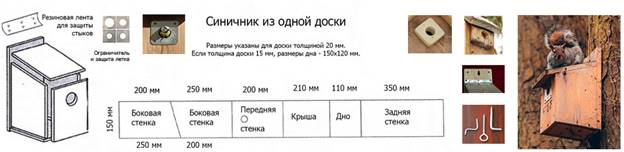 Если неохота мудрить с обрезками, самый простой вариант – синичник с плоской крышей из одной доски. В этом раскрое днище получается не квадратным, а прямоугольным. Меньшая сторона прямоугольника равна ширине доски минус две ее толщины, то есть в данном случае 150 – 2х20 = 110. 100 мм – минимально допустимое значение для синичника. Следовательно, доска чуть поуже, шириной 140 мм также сгодится: 140 – 2х20 = 100. На значения остальных деталей в чертеже замена не влияет. Орнитологи настоятельно рекомендуют использовать материал толщиной 20 мм. Если такого в хозяйстве нет, зато нашлась доска 15 мм, тоже хорошо. Формула прежняя: 150 – 2х15 = 120. Обратите внимание: жильцам комфортнее в домике со встроенным днищем. В этом случае дождевая вода стекает отвесно вниз, не проникая по стыкам внутрь. Задняя стенка здесь на 100 мм превышает высоту домика – для удобства при развешивании на дереве или креплении к стене.