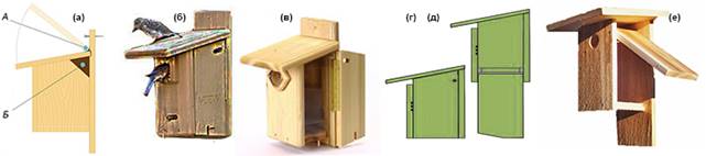 Рисунок 3. а) Откидная крыша. А – полоска из прочной резины удерживает крышу на месте и не позволяет воде затекать внутрь. Б – леток можно ориентировать в удобную для наблюдателя сторону. Если делать его в боковой стенке, в эту же сторону следует удлинить крышу. б) и в) Крепление дверцы на петлях к задней стенке. В качестве замка в торец днища вкручен костыль (в), для которого в боковой стенке (б) сделана прорезь. Запирается/отпирается дверца поворотом костыля. г) и д) Крепление боковой стенки на петлях к днищу, д) Открытая стенка откидывается вниз. е) Боковая стенка – дверца-вертушка. Два самореза строго напротив друг друга образуют горизонтальную ось вращения.