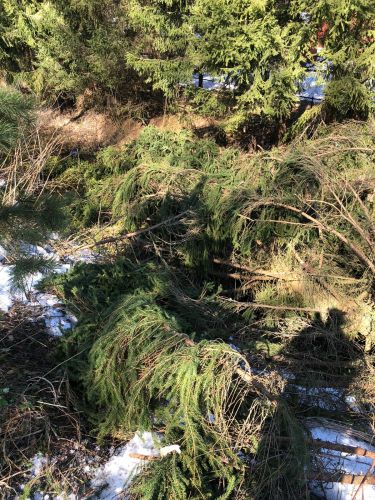 В выходные был сильный ветер и огромная часть елки сломалась и упала в канаву. Владельцу участка повезло - елка не упала на крышу дома....