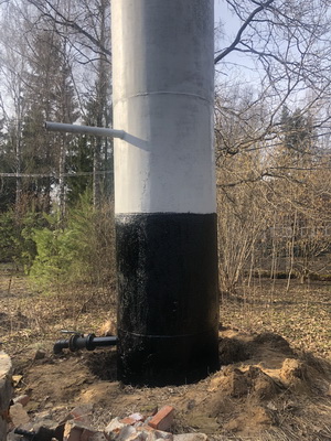 Заварили видимые отверстия ( там, где были следы течи из водонапорной башни), покрасили половину башни по стыковочный шов, а нижнюю часть покрыли резиново-битумным материалом. Узел от колодца до помещения скважины заменили и сделали наклон в сторону колодца.