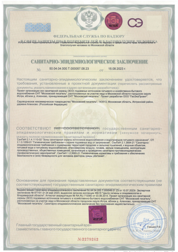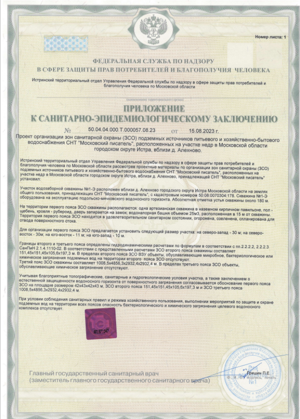 В рамках выполнения условий использования скважиной СНТ получено - санитарно-эпидемиологическое заключение. Определены  размеры зоны, теперь надо забор делать....